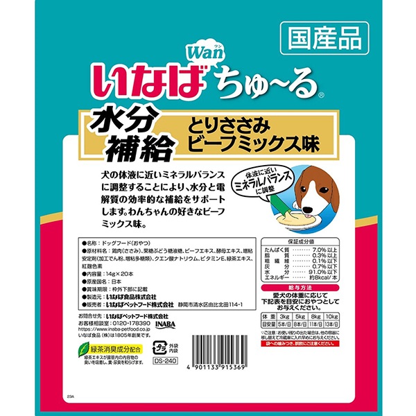 - 鶏肉(ささみ)、果糖ぶどう糖液糖、ビーフエキス、酵母エキス、増粘安定剤(加工でん粉、増粘多糖類)、クエン酸ナトリウム、ビタミンE、緑茶エキス、紅麹色素