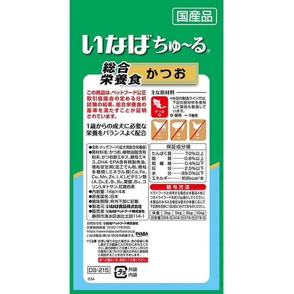 - かつお、植物油脂含有粉末、かつお節エキス、酵母エキス、DHA・EPA含有精製魚油、増粘安定剤(加工でん粉、増粘多糖類)、ミネラル類(Ca、Fe、Cu、Mn、Zn、I、K)、ビタミン類(A、D3、E、B1、B2、葉酸、B12、コリン)、キトサン、紅麹色素