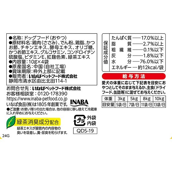 - 鶏肉(ささみ)、でん粉、鶏脂、かつお節、チキンエキス、酵母エキス、オリゴ糖、かつお節エキス、グルコサミン、コンドロイチン硫酸塩、ビタミンE、紅麹色素、緑茶エキス