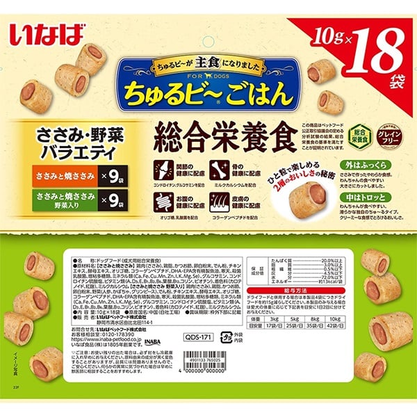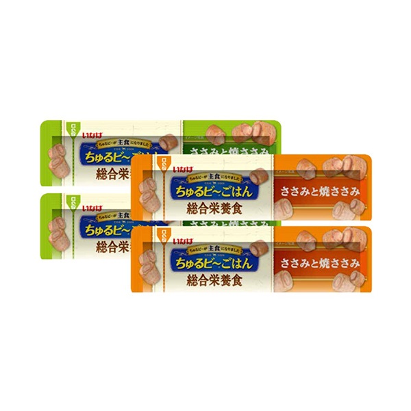 - 【ささみと焼ささみ】鶏肉(ささみ)、鶏脂、かつお節、卵白粉末、でん粉、チキンエキス、酵母エキス、オリゴ糖、コラーゲンペプチド、DHA・EPA含有精製魚油、寒天、殺菌乳酸菌、増粘多糖類、ミネラル類(Ca、Fe、Cu、Mn、Zn、I、K、Mg、Se)、グルコサミン、コンドロイチン硫酸塩、ビタミン類(A、D3、E、B1、B2、B6、葉酸、B12、コリン、ビオチン)、着色料(カロテノイド、紅麹)、ミルクカルシウム 【ささみと焼ささみ 野菜入り】鶏肉(ささみ)、鶏脂、かつお節、卵白粉末、野菜(人参、かぼちゃ、グリンピース)、でん粉、チキンエキス、酵母エキス、オリゴ糖、コラーゲンペプチド、DHA・EPA含有精製魚油、寒天、殺菌乳酸菌、増粘多糖類、ミネラル類(Ca、Fe、Cu、Mn、Zn、I、K、Mg、Se)、グルコサミン、コンドロイチン硫酸塩、ビタミン類(A、D3、E、B1、B2、B6、葉酸、B12、コリン、ビオチン)、着色料(カロテノイド、紅麹)、ミルクカルシウム