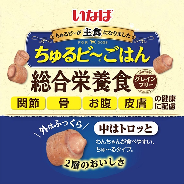 外はふっくら、中はとろっと2つの食感が楽しめる総合栄養食。関節・骨・お腹・皮膚の健康に配慮しました。柔らかな噛み応えなので、固いものが苦手になったワンちゃんにも。
