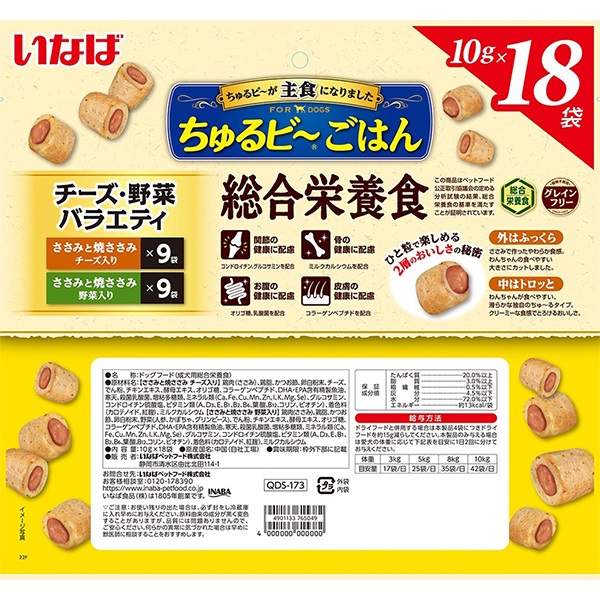 - 【ささみと焼ささみ チーズ入り】鶏肉(ささみ)、鶏脂、かつお節、卵白粉末、チーズ、でん粉、チキンエキス、酵母エキス、オリゴ糖、コラーゲンペプチド、DHA・EPA含有精製魚油、寒天、殺菌乳酸菌、増粘多糖類、ミネラル類(Ca、Fe、Cu、Mn、Zn、I、K、Mg、Se)、グルコサミン、コンドロイチン硫酸塩、ビタミン類(A、D3、E、B1、B2、B6、葉酸、B12、コリン、ビオチン)、着色料(カロテノイド、紅麹)、ミルクカルシウム 【ささみと焼ささみ 野菜入り】鶏肉(ささみ)、鶏脂、かつお節、卵白粉末、野菜(人参、かぼちゃ、グリンピース)、でん粉、チキンエキス、酵母エキス、オリゴ糖、コラーゲンペプチド、DHA・EPA含有精製魚油、寒天、殺菌乳酸菌、増粘多糖類、ミネラル類(Ca、Fe、Cu、Mn、Zn、I、K、Mg、Se)、グルコサミン、コンドロイチン硫酸塩、ビタミン類(A、D3、E、B1、B2、B6、葉酸、B12、コリン、ビオチン)、着色料(カロテノイド、紅麹)、ミルクカルシウム