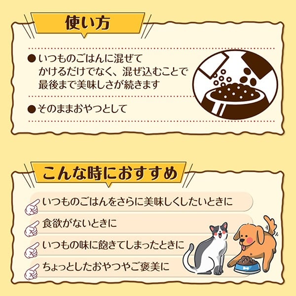 - 鶏肉(ささみ)、まぐろ、かつお節、鶏脂、でん粉、卵白粉末、かつお節エキス、酵母エキス、寒天、カゼインナトリウム、増粘多糖類、ビタミンE、紅麹色素、緑茶エキス