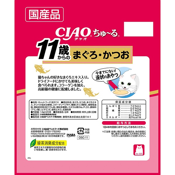 今までにない液状のおやつです。ちゅ~っと出して、猫ちゃんがペロペロなめて楽しめます。11歳からの猫ちゃんの為にコラーゲン配合。