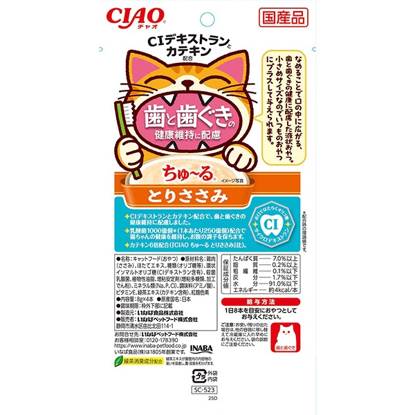 - 鶏肉(ささみ)、ほたてエキス、糖類(オリゴ糖等)、環状イソマルトオリゴ糖(CIデキストラン含有)、殺菌乳酸菌、植物性油脂、増粘安定剤(増粘多糖類、加工でん粉)、ミネラル類(Na、P、Cl)、調味料(アミノ酸)、ビタミンE、緑茶エキス(カテキン含有)、紅麹色素