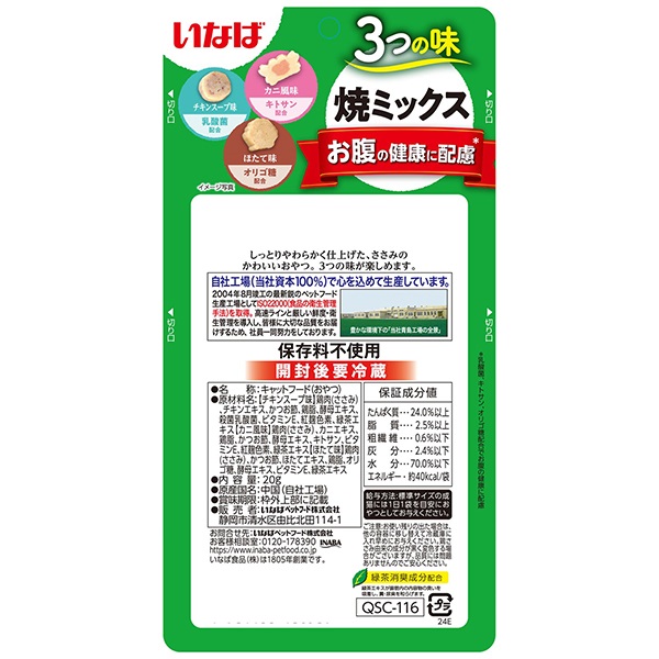 - 【チキンスープ味】鶏肉(ささみ)、チキンエキス、かつお節、鶏脂、酵母エキス、殺菌乳酸菌、ビタミンE、紅麹色素、緑茶エキス【カニ風味】鶏肉(ささみ)、カニエキス、鶏脂、かつお節、酵母エキス、キトサン、ビタミンE、紅麹色素、緑茶エキス【ほたて味】鶏肉(ささみ)、かつお節、ほたてエキス、鶏脂、オリゴ糖、酵母エキス、ビタミンE、緑茶エキス