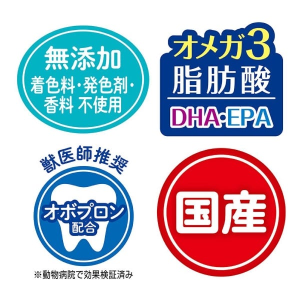 毎日のおやつに乳酸菌プラス。キリンの35年の研究から生まれたプラズマ乳酸菌配合。健康を維持し免疫力を保つ。噛むことで歯垢を落としお口スッキリ!オメガ3脂肪酸(DHA・EPA)配合。獣医師推奨オボプロン配合。