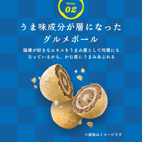 - 穀類(とうもろこし、小麦粉、コーングルテンミール、玄米)、肉類(ミートミール、チキンミール、チキンレバーパウダー、チキンエキスパウダー)、油脂類(動物性油脂、植物性油脂)、豆類(脱脂大豆)、寒梅粉(でん粉、もち米粉)、糖類(砂糖)、魚介類(フィッシュエキス、まぐろ節粉末、カニエキスパウダー)、セレン酵母、ビタミン類(A、D3、E、K3、B1、B2、パントテン酸、ナイアシン、B6、葉酸、ビオチン、B12、コリン、イノシトール)、ミネラル類(カルシウム、リン、ナトリウム、カリウム、塩素、鉄、コバルト、銅、マンガン、亜鉛、ヨウ素)、アミノ酸類(メチオニン、タウリン)、クチナシ色素、酸化防止剤(ローズマリー抽出物、ミックストコフェロール)、膨張剤