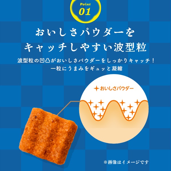 - 穀類(とうもろこし、小麦粉、コーングルテンミール、玄米)、肉類(ミートミール、チキンミール、チキンレバーパウダー、チキンエキスパウダー)、油脂類(動物性油脂、植物性油脂)、豆類(脱脂大豆)、寒梅粉(でん粉、もち米粉)、糖類(砂糖)、魚介類(フィッシュエキス、まぐろ節粉末、カニエキスパウダー)、乳類(チーズパウダー)、セレン酵母、ビタミン類(A、D3、E、K3、B1、B2、パントテン酸、ナイアシン、B6、葉酸、ビオチン、B12、コリン、イノシトール)、ミネラル類(カルシウム、リン、ナトリウム、カリウム、塩素、鉄、コバルト、銅、マンガン、亜鉛、ヨウ素)、アミノ酸類(メチオニン、タウリン)、クチナシ色素、酸化防止剤(ローズマリー抽出物、ミックストコフェロール)、膨張剤