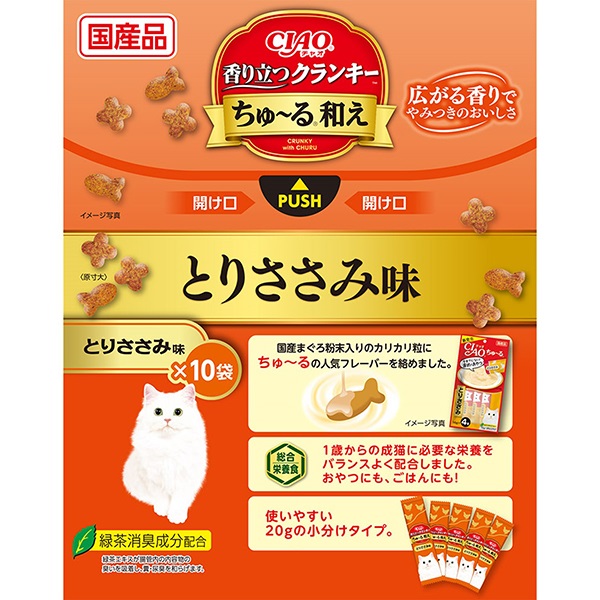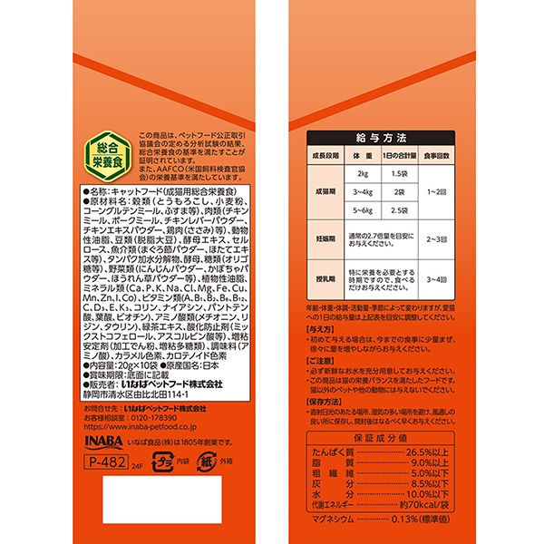 - 穀類(とうもろこし、小麦粉、コーングルテンミール、ふすま等)、肉類(チキンミール、ポークミール、チキンレバーパウダー、チキンエキスパウダー、鶏肉(ささみ)等)、動物性油脂、豆類(脱脂大豆)、酵母エキス、セルロース、魚介類(まぐろ節パウダー、ほたてエキス等)、タンパク加水分解物、酵母、糖類(オリゴ糖等)、野菜類(にんじんパウダー、かぼちゃパウダー、ほうれん草パウダー等)、植物性油脂、ミネラル類(Ca、P、K、Na、Cl、Mg、Fe、Cu、Mn、Zn、I、Co)、ビタミン類(A、B1、B2、B6、B12、C、D3、E、K3、コリン、ナイアシン、パントテン酸、葉酸、ビオチン)、アミノ酸類(メチオニン、リジン、タウリン)、緑茶エキス、酸化防止剤(ミックストコフェロール、アスコルビン酸等)、増粘安定剤(加工でん粉、増粘多糖類)、調味料(アミノ酸)、カラメル色素、カロテノイド色素