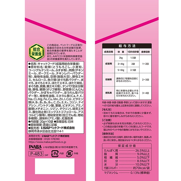 - 穀類(とうもろこし、小麦粉、コーングルテンミール、ふすま等)、肉類(チキンミール、ポークミール、チキンレバーパウダー等)、動物性油脂、豆類(脱脂大豆)、酵母エキス、セルロース、魚介類(まぐろ節パウダー、まぐろ、まぐろエキス、ほたてエキス、ほたて貝柱、まぐろ節、真鯛、鯛エキス等)、タンパク加水分解物、酵母、糖類(オリゴ糖等)、野菜類(にんじんパウダー、かぼちゃパウダー、ほうれん草パウダー等)、植物性油脂、ミネラル類(Ca、P、K、Na、Cl、Mg、Fe、Cu、Mn、Zn、I、Co)、ビタミン類(A、B1、B2、B6、B12、C、D3、E、K3、コリン、ナイアシン、パントテン酸、葉酸、ビオチン)、アミノ酸類(メチオニン、リジン、タウリン)、緑茶エキス、酸化防止剤(ミックストコフェロール、アスコルビン酸等)、増粘安定剤(加工でん粉、増粘多糖類)、調味料(アミノ酸)、紅麹色素