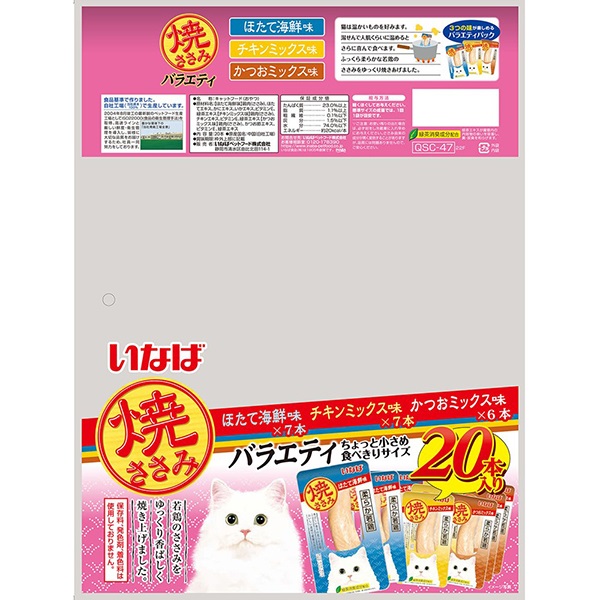 - 【ほたて海鮮味】鶏肉(ささみ)、ほたてエキス、カニエキス、いかエキス、ビタミンE、緑茶エキス【チキンミックス味】鶏肉(ささみ)、チキンエキス、ビタミンE、緑茶エキス【かつおミックス味】鶏肉(ささみ)、かつお節エキス、ビタミンE、緑茶エキス