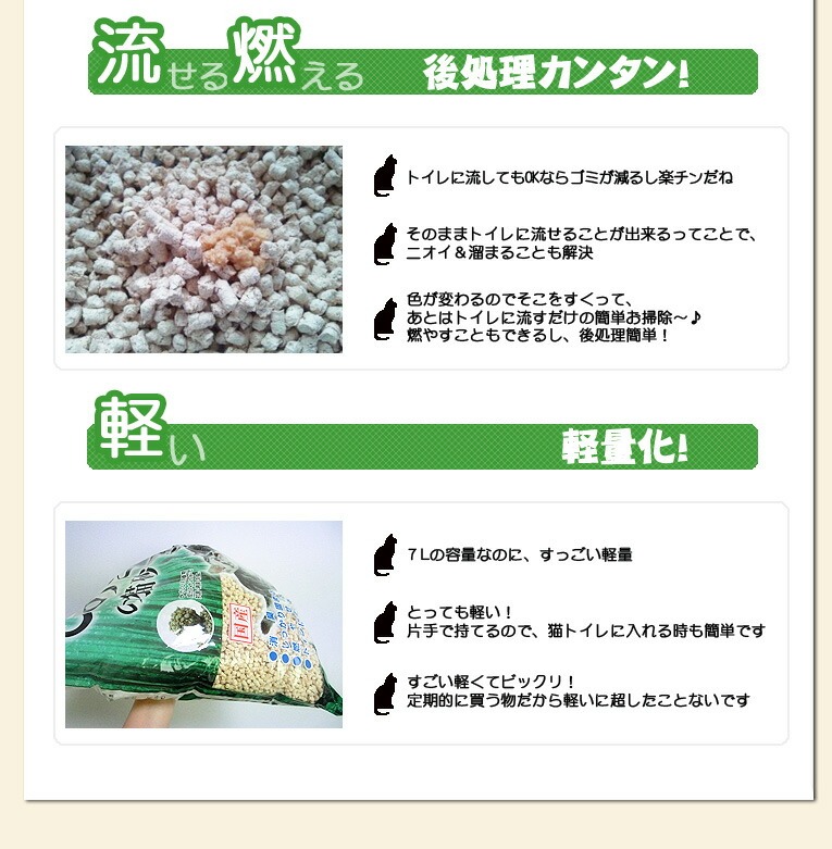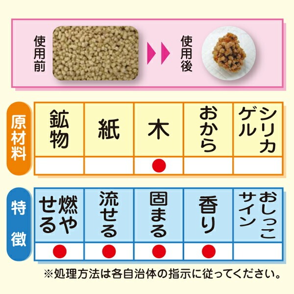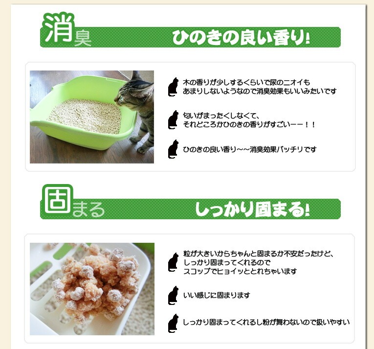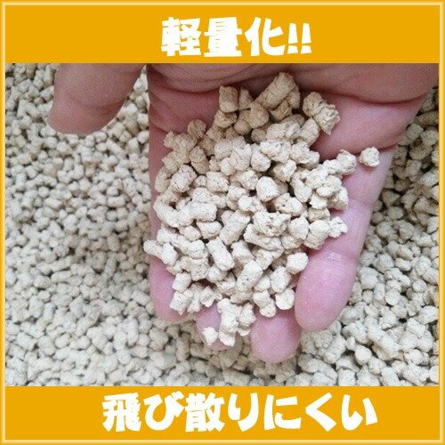 ひのきの香りが付いたとっても軽い猫砂です。ひのきに含まれる消臭成分フィトンチッドが悪臭成分を抑え、イヤな臭いや雑菌を抑えます。<燃・流・固><燃やせる、流せる、固まる、ひのきの香り付き>
