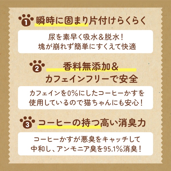コーヒーの持つ高い消臭力!瞬時に固まり片付けらくらく!香料無添加+カフェインフリー!砂ほこりが立ちにくい!