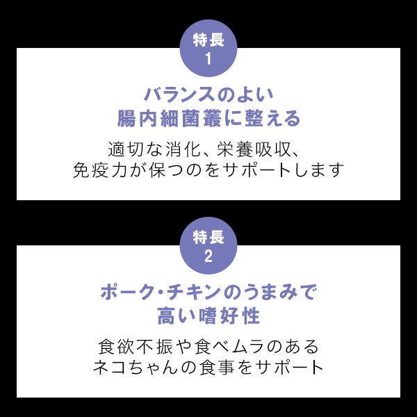 - タンパク加水分解物(ポーク、チキン)、酵母、乳酸菌、アミノ酸類(タウリン)、酸化ケイ素
