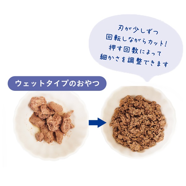 色々なフード・おやつ等を細かくすることで、苦手な食材やシニアや仔犬・仔猫も食べやすいように小さく与えたり、いつもの食事にアクセントとしてふりかけにしたり、手作りごはんにも便利。