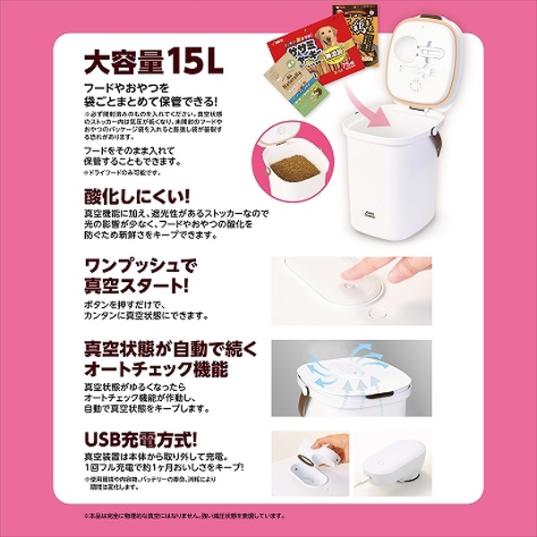 真空状態でフードやおやつをまとめて保管できる大容量のストッカーです。
