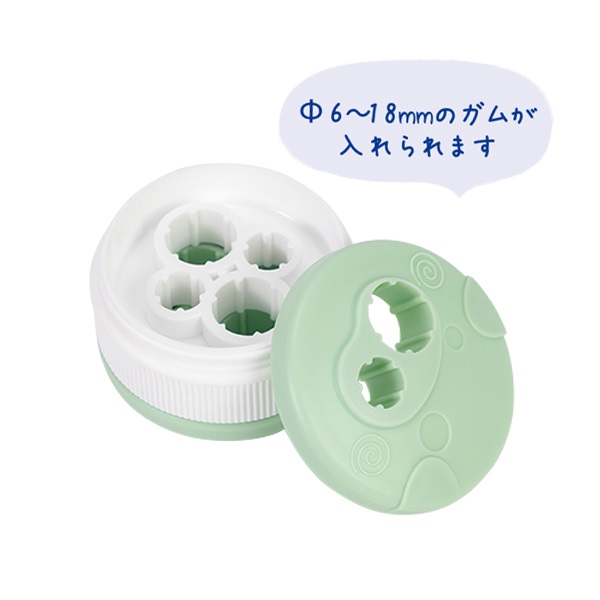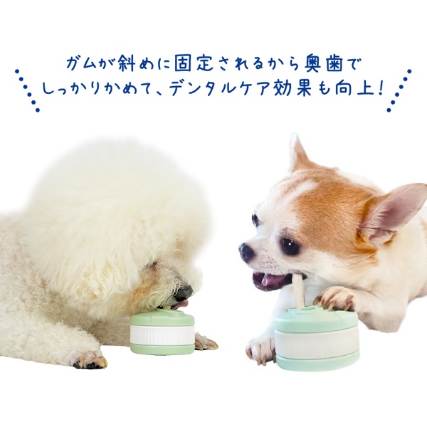 デンタルガムをポンと入れてギュッと回すだけで簡単にセットでき、立てて固定できるから楽しく噛めてデンタル効果UP!
