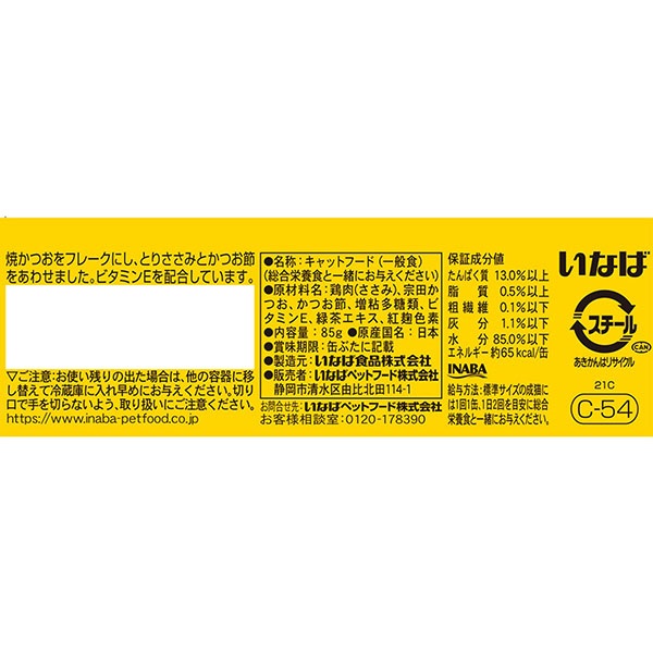 高たんぱくで低脂肪のささみに、人気の風味豊かな焼かつおフレークを合わせました。緑茶成分配合によりフン尿臭が和らぎます。