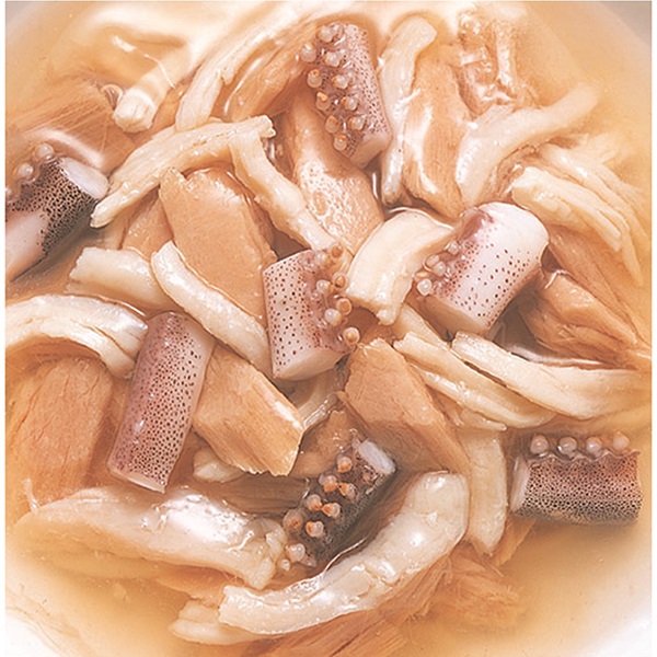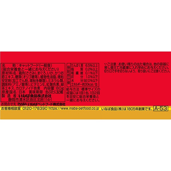 鶏肉(ささみ)、まぐろ、いか、かつお節エキス、糖類(オリゴ糖等)、植物性油脂、増粘安定剤(加工でん粉、増粘多糖類)、ミネラル類、調味料(アミノ酸等)、ビタミンE、紅麹色素、緑茶エキス、カロテノイド色素