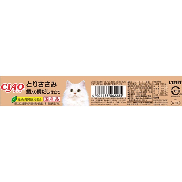 鶏肉(ささみ)、鯛、鯛エキス、でん粉、増粘多糖類、増粘剤(加工でん粉)、ビタミンE、緑茶エキス