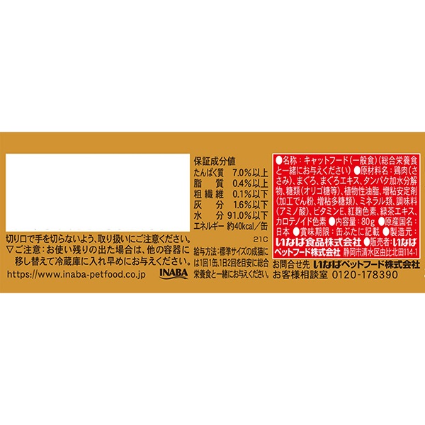 - 鶏肉(ささみ)、まぐろ、まぐろエキス、タンパク加水分解物、糖類(オリゴ糖等)、植物性油脂、増粘安定剤(加工でん粉、増粘多糖類)、ミネラル類、調味料(アミノ酸)、ビタミンE、紅麹色素、緑茶エキス、カロテノイド色素