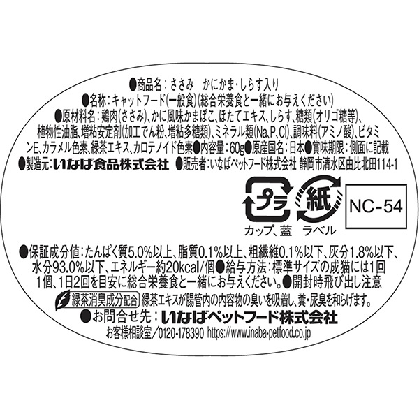 - 鶏肉(ささみ)、かに風味かまぼこ、ほたてエキス、しらす、糖類(オリゴ糖等)、植物性油脂、増粘安定剤(加工でん粉、増粘多糖類)、ミネラル類(Na、P、Cl)、調味料(アミノ酸)、ビタミンE、カラメル色素、緑茶エキス、カロテノイド色素