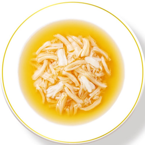 鶏肉(ささみ)、ほたて貝柱、かつお節だし、かつお節エキス、ほたてエキス、糖類(オリゴ糖等)、植物性油脂、増粘安定剤(増粘多糖類、加工でん粉)、ミネラル類(Na、P、Cl)、調味料(アミノ酸)、ビタミンE、カラメル色素、カロテノイド色素、緑茶エキス