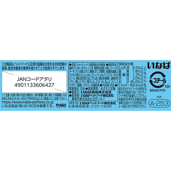 たんぱく質:8.5%以上、脂質:1.8%以上、粗繊維:1.2%以下、灰分:3.0%以下、水分:85.0%以下