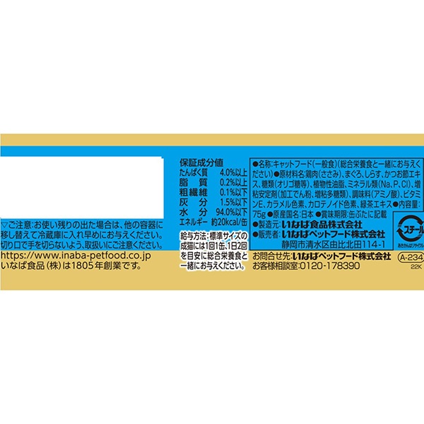 鶏肉(ささみ)、まぐろ、しらす、かつお節エキス、糖類(オリゴ糖等)、植物性油脂、ミネラル類(Na、P、Cl)、増粘安定剤(加工でん粉、増粘多糖類)、調味料(アミノ酸)、ビタミンE、カラメル色素、カロテノイド色素、緑茶エキス