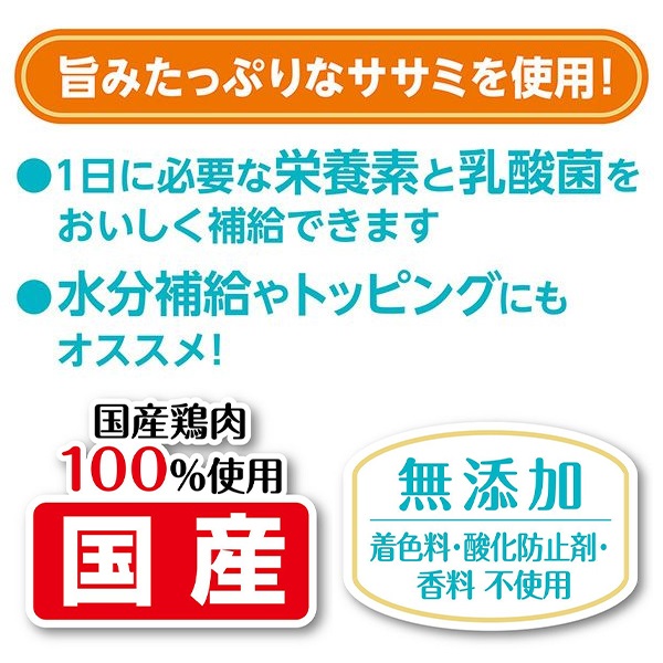 - 肉類(鶏・鶏レバー・鶏ササミ)、鶏脂、まぐろエキス、チキンエキス、小麦粉、殺菌乳酸菌(プラズマ乳酸菌)、酵母、オリゴ糖、増粘多糖類、ミネラル類(カルシウム・塩素・ナトリウム・リン・亜鉛・鉄・銅・ヨウ素・マンガン・コバルト・ケイ素)、ビタミン類(A・B1・B2・B6・B12・C・D・E・ナイアシン・パントテン酸・コリン)、タウリン、メチオニン