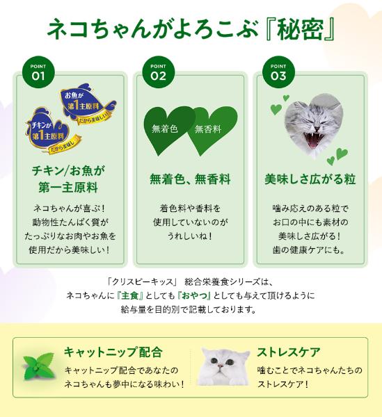 - チキン、米、牛脂、コーングルテン、たんぱく加水分解物、モルトエキス、ぶどう糖、酵母、ひまわり油、キャットニップパウダー、海藻粉末、にんじん、えんどう豆、ミネラル類(カルシウム、リン、カリウム、ナトリウム、クロライド、鉄、銅、マンガン、亜鉛、ヨウ素、セレン)、ビタミン類(A、D、E、K、B1、B2、パントテン酸、ナイアシン、B6、葉酸、ビオチン、B12、コリン)、アミノ酸類(タウリン)、酸味料、酸化防止剤(ミックストコフェロール)