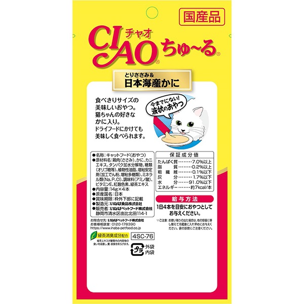 - 鶏肉(ささみ)、かに、カニエキス、タンパク加水分解物、糖類(オリゴ糖等)、植物性油脂、増粘剤(加工でん粉)、増粘多糖類、ミネラル類、調味料(アミノ酸等)、ビタミンE、紅麹色素、緑茶エキス