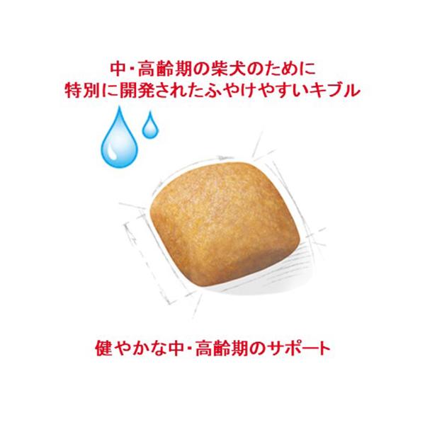 中・高齢期の柴犬のために特別に設計された、最適な大きさ、形、食感のキブル(粒)です。また固いものが食べにくくなった中・高齢期の柴犬でも食べやすいようにふやけやすいキブル(粒)で食欲を刺激します。ポリリン酸ナトリウム配合。