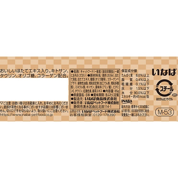 鶏肉(ささみ)、ほたて貝柱、ほたてエキス、糖類(オリゴ糖等)、コラーゲンペプチド、植物性油脂、増粘剤(加工でん粉)、ミネラル類、キトサン、調味料(アミノ酸等)、増粘多糖類、ビタミンE、タウリン、紅麹色素、緑茶エキス