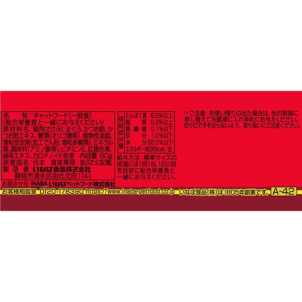 鶏肉(ささみ)、まぐろ、かつお節、かつお節エキス、糖類(オリゴ糖等)、植物性油脂、増粘安定剤(加工でん粉、増粘多糖類)、ミネラル類、調味料(アミノ酸等)、ビタミンE、紅麹色素、緑茶エキス、カロテノイド色素