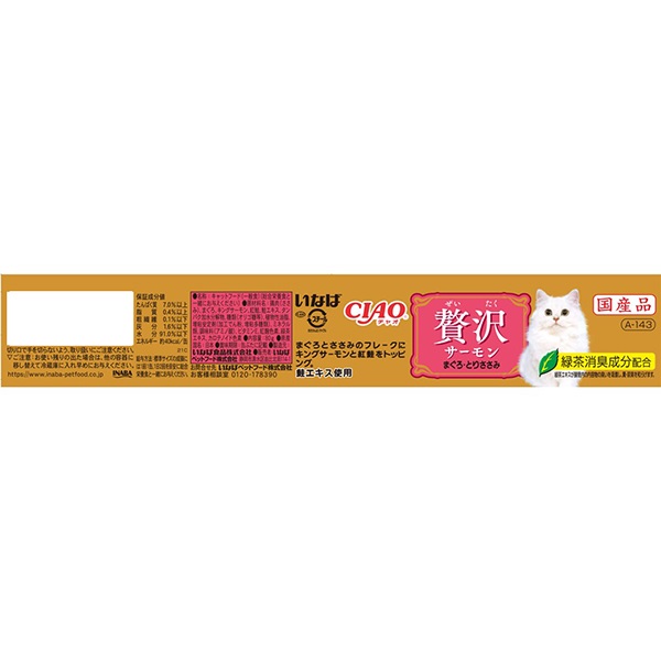 - 鶏肉(ささみ)、まぐろ、キングサーモン、紅鮭、鮭エキス、タンパク加水分解物、糖類(オリゴ糖等)、植物性油脂、増粘安定剤(加工でん粉、増粘多糖類)、ミネラル類、調味料(アミノ酸)、ビタミンE、紅麹色素、緑茶エキス、カロテノイド色素