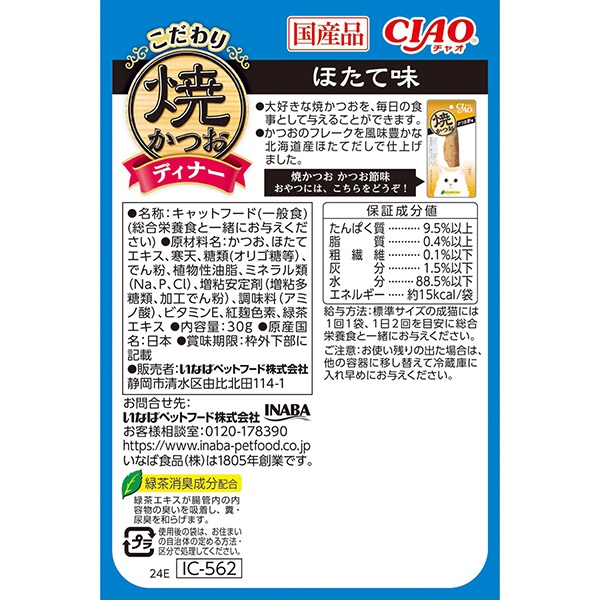 - かつお、ほたてエキス、寒天、糖類(オリゴ糖等)、でん粉、植物性油脂、ミネラル類(Na、P、Cl)、増粘安定剤(増粘多糖類、加工でん粉)、調味料(アミノ酸)、ビタミンE、紅麹色素、緑茶エキス