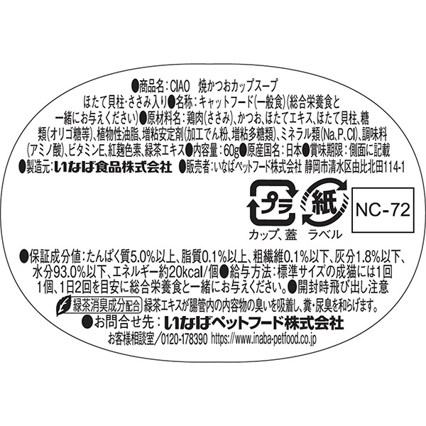 鶏肉(ささみ)、かつお、ほたてエキス、ほたて貝柱、糖類(オリゴ糖等)、植物性油脂、ミネラル類、増粘安定剤(加工でん粉、増粘多糖類)、ミネラル類(Na、P、CI)、調味料(アミノ酸)、ビタミンE、紅麹色素、緑茶エキス