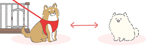 サークルから出す場合は、ハーネスとリードをつけて、コントロールしながら先住犬と慣れさせる