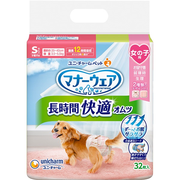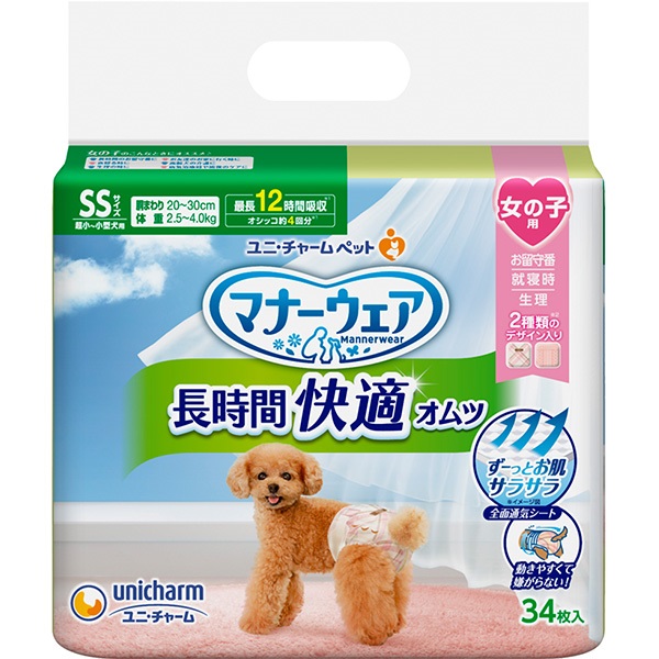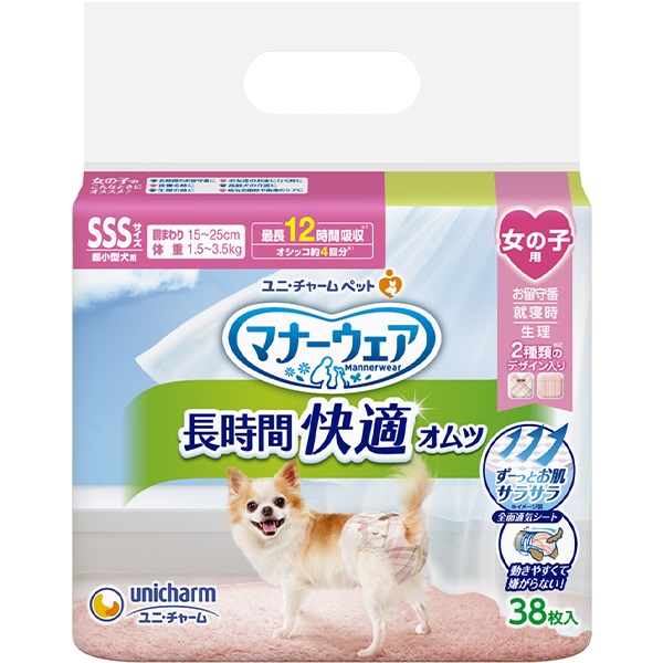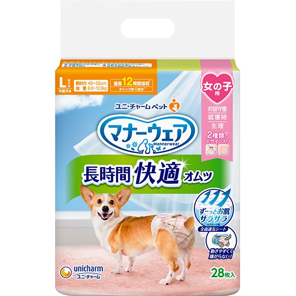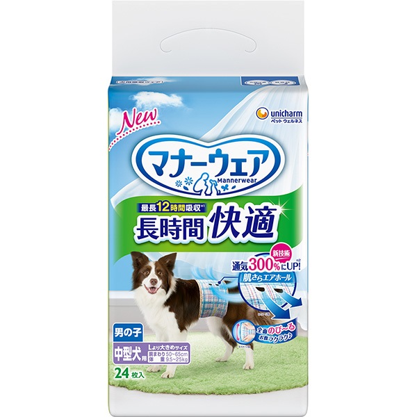 「マナーウェア長時間オムツ」は長時間着けていてもずーっとお肌サラサラ、かつ動きやすいのでワンちゃんが長時間快適でいられる紙オムツです。男の子用、女の子用、男女共用の中から愛犬に適した形状、機能をお選び頂けます。