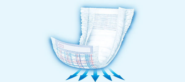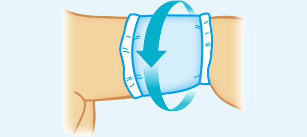 しっかりしめながら、製品の吸収体面と白いテープをくっつけてしっかり留めてください。テープはつけ直しができます。テープは背中側で留めてください。