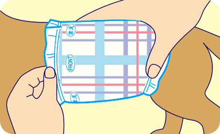 白い吸収体の面を上にして、製品を広げた状態でお腹の下側にもってきます。