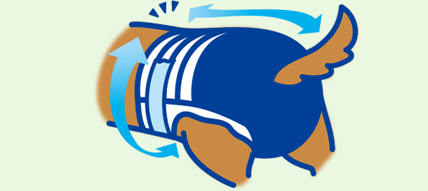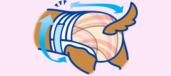 ※前足側からのオシッコのモレを防ぐために、前後でギャザーの設計を変えています。