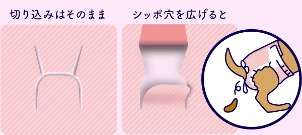 シッポ穴が小さい場合切れ目を広げて、シッポ穴を広げてください。