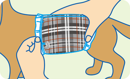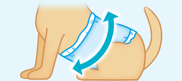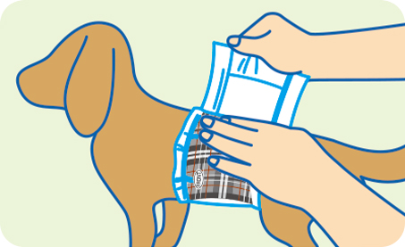白い吸収体の面を上にして、製品を広げた状態でお腹の下側にもってきます。左手でワンちゃんと製品をしっかり抑えながら、体にフィットするように、しっかりしめてください。